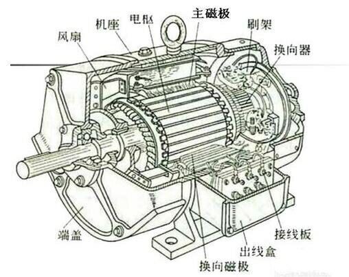 直流電機的結構多種多樣,但原理相同。定子上總有一對直流勵磁的靜止的主磁極N和S,在旋轉部分轉子上安裝有電樞鐵芯。線圈的首和尾分別連接到兩個圓弧形的銅片上,即換向片,換向片之間是絕緣的。當電樞轉動時,電樞線圈通過換向片和電刷與外電路接通。