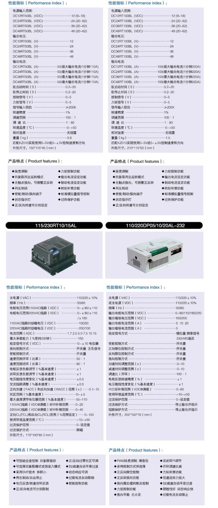 直流電機(jī)控制器是采用數(shù)字控制調(diào)速技術(shù)和專用器件,研制生產(chǎn)的高精度電子調(diào)速配置。具有結(jié)構(gòu)簡(jiǎn)單、體積小、重量輕等優(yōu)點(diǎn),可用于SZ系列、ZYT系列、Z2系列功率為幾十瓦~幾千瓦的直流電動(dòng)機(jī)的無(wú)級(jí)調(diào)速。具有多重保護(hù)功能,穩(wěn)定可靠。完全可兼容同類產(chǎn)品。